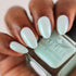 This solar polish starts off with a minty white base indoors that quickly shifts to blue in full sun and is loaded with green/blue shimmer.